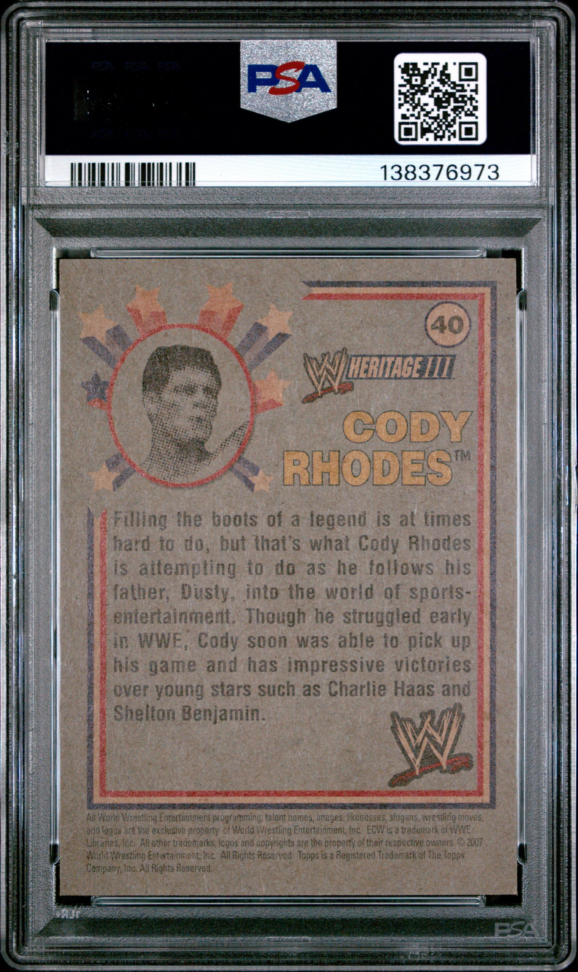You are purchasing a 2007 Topps WWE Heritage III Cody Rhodes #40 PSA. You will receive the exact item in the photographs. Thank you for looking. Listed With Mascot.