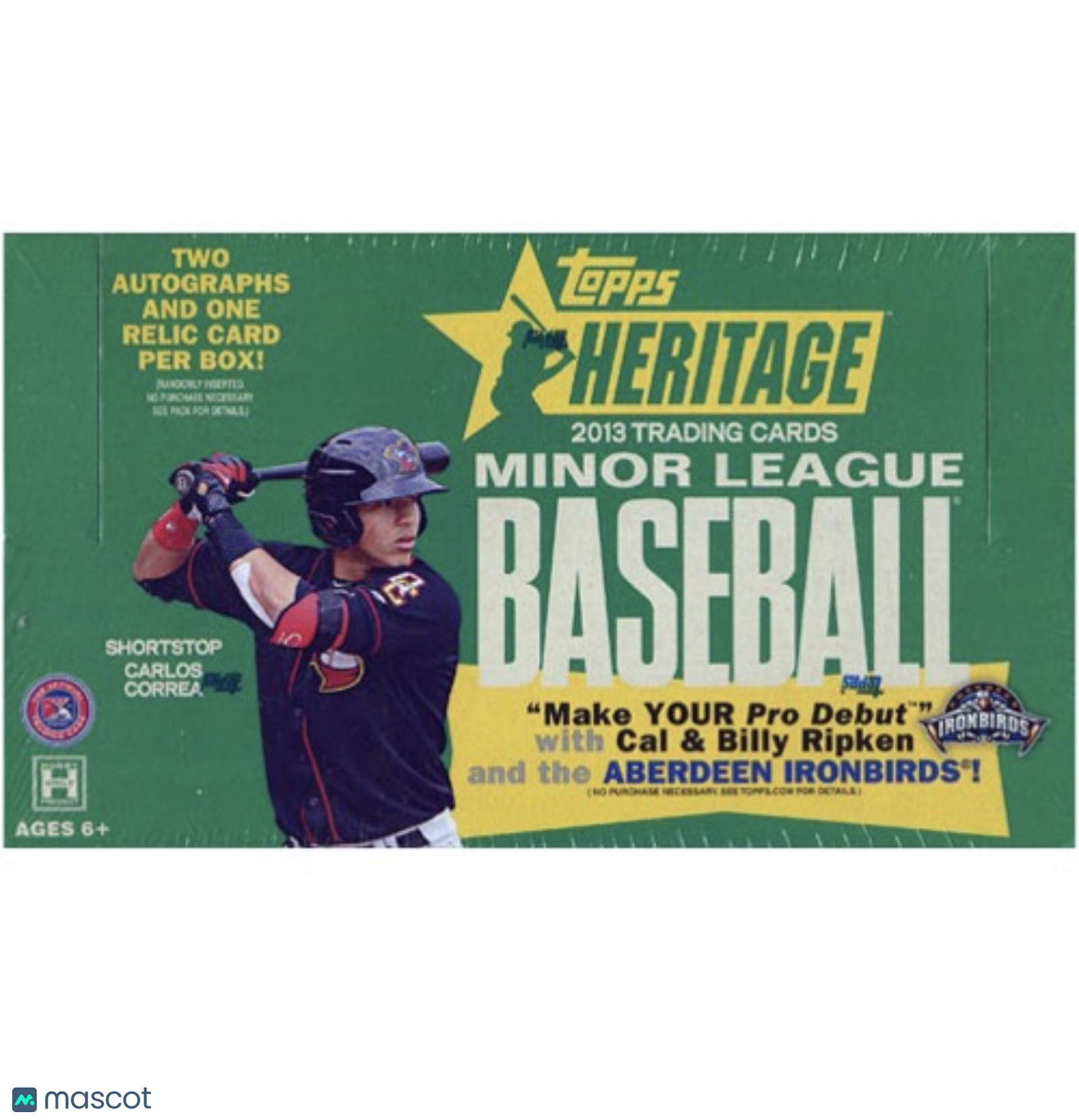 You are purchasing a 2013 Topps Heritage Minor League Baseball Hobby Box. You will receive the exact item in the photographs. Thank you for looking. Listed With Mascot.