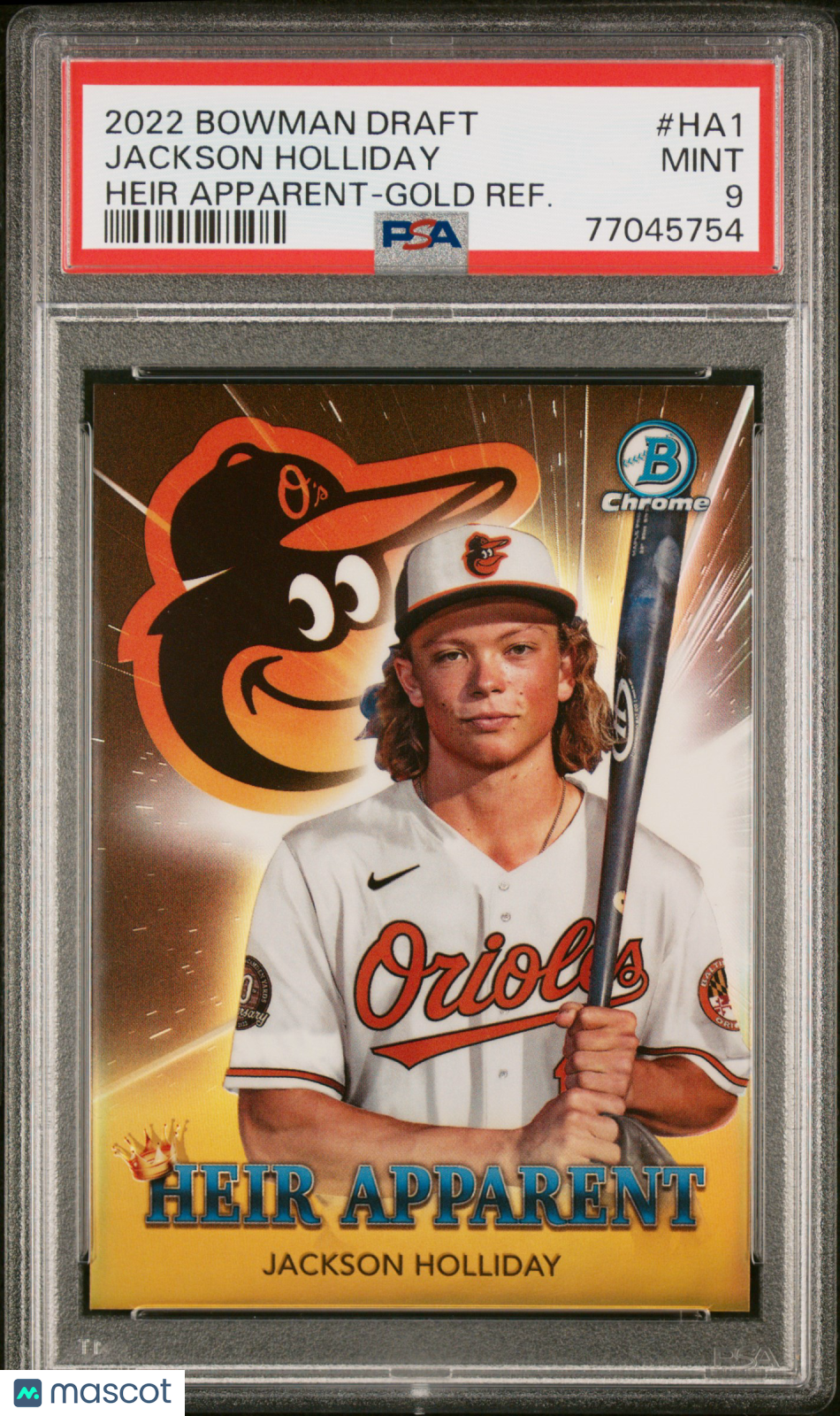 You are purchasing a 2022 Bowman Draft Heir Apparent Jackson Holliday #HA1 Gold Refractor PSA. You will receive the exact item in the photographs. Thank you for looking. Listed With Mascot.