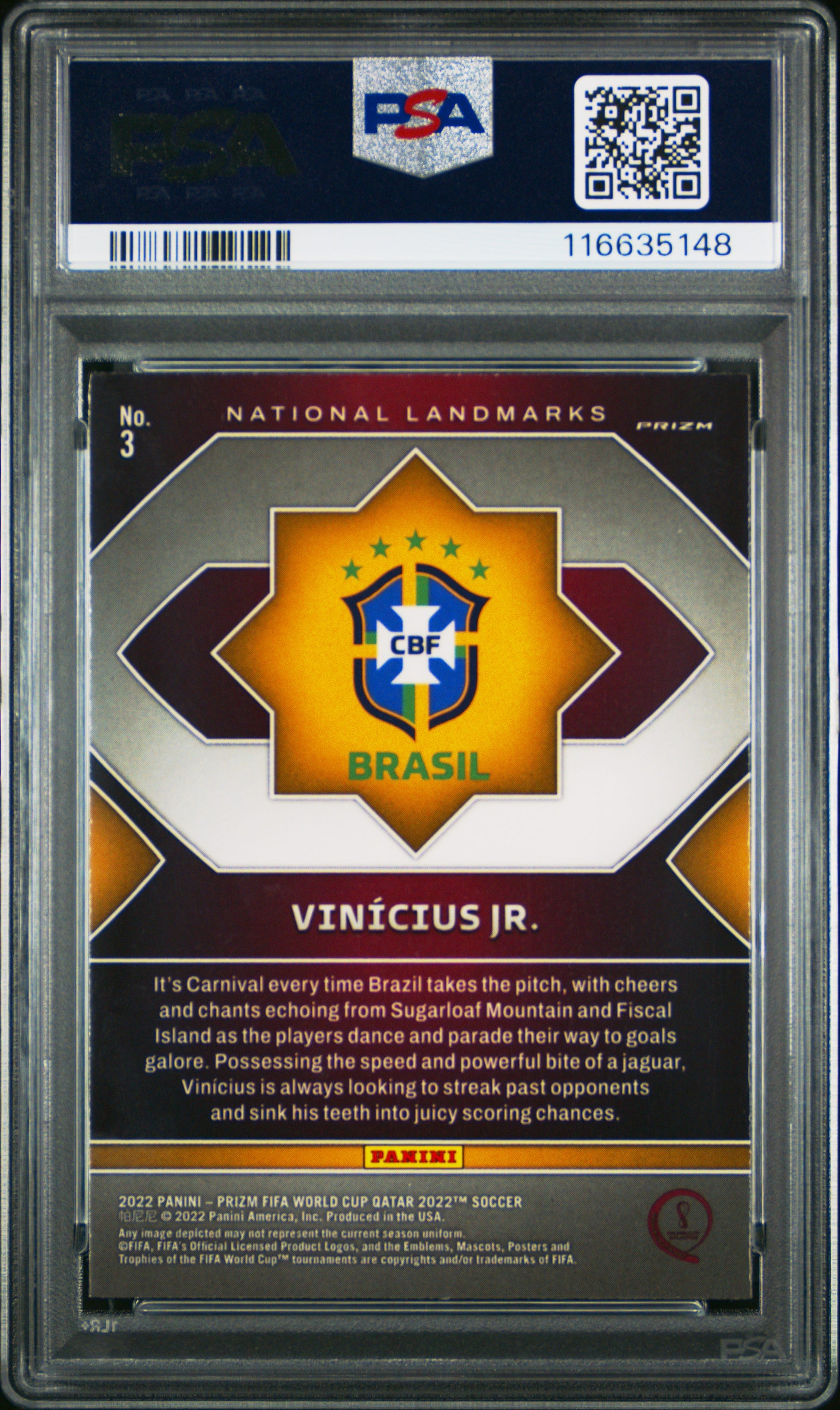 You are purchasing a 2022 Panini Prizm World Cup Qatar National Landmarks Vinicius JR. #3 PSA. You will receive the exact item in the photographs. Thank you for looking. Listed With Mascot.