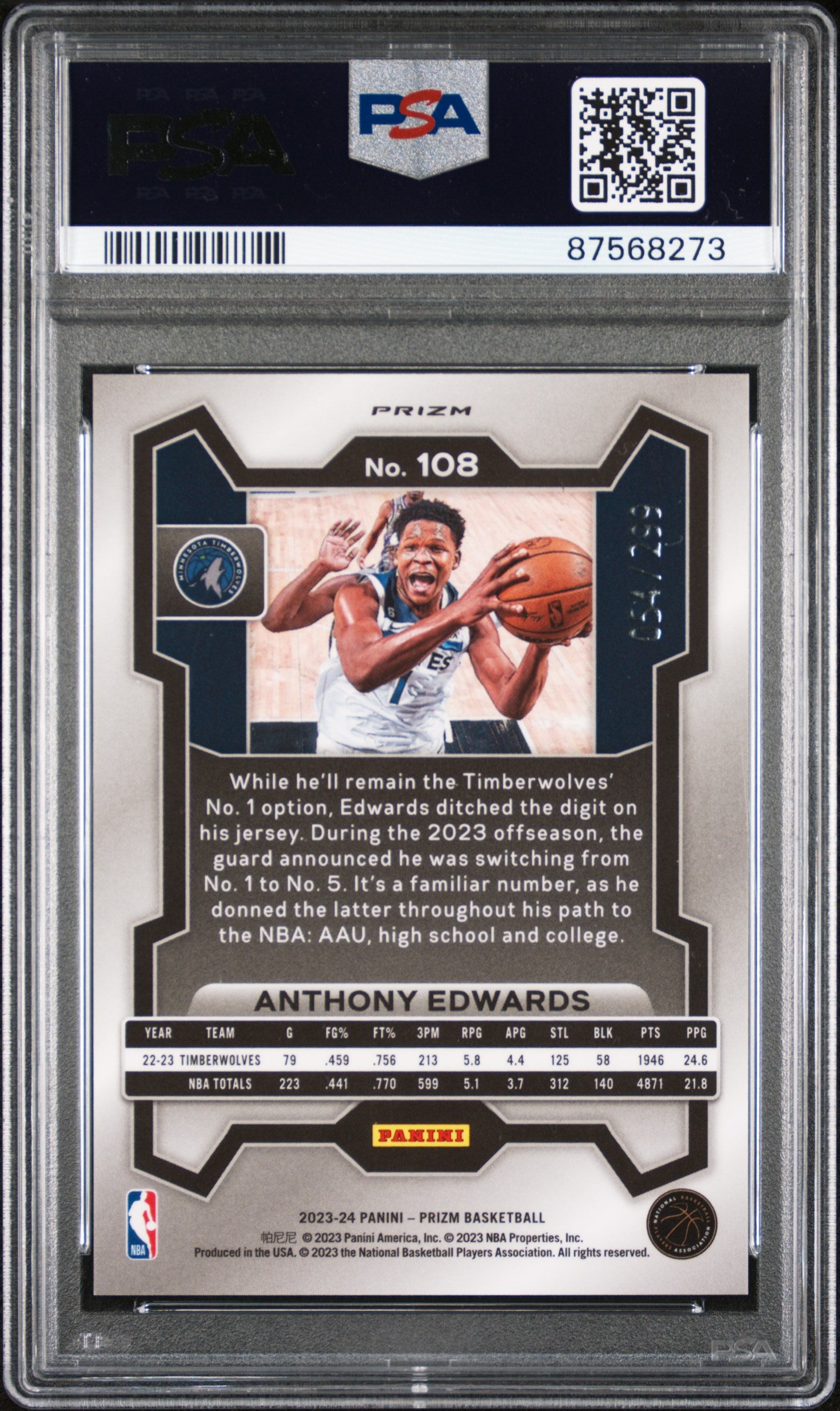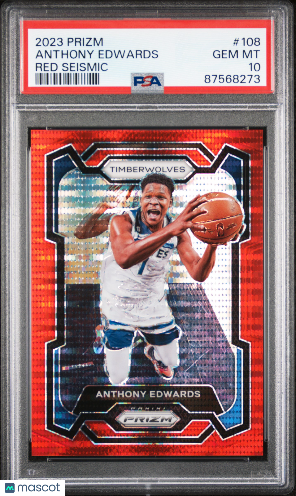 You are purchasing a 2023 Panini Prizm Anthony Edwards #108 Red Seismic PSA. You will receive the exact item in the photographs. Thank you for looking. Listed With Mascot.