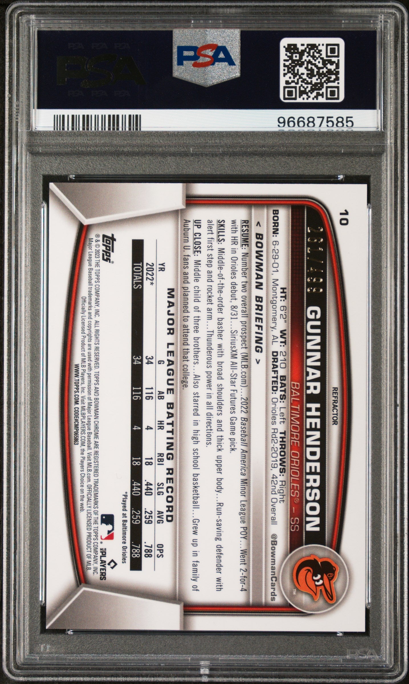 You are purchasing a 2023 Bowman Chrome Gunnar Henderson #10 Refractor PSA. You will receive the exact item in the photographs. Thank you for looking. Listed With Mascot.