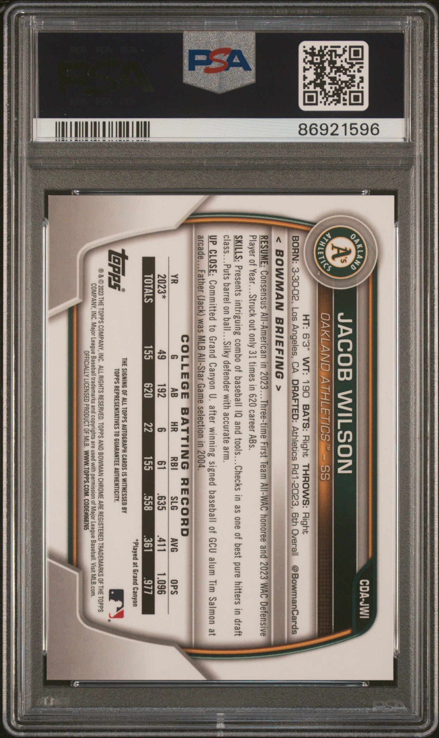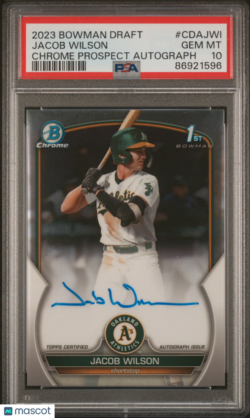 You are purchasing a 2023 Bowman Draft Chrome Prospect Autograph Jacob Wilson #CDAJWI PSA. You will receive the exact item in the photographs. Thank you for looking. Listed With Mascot.