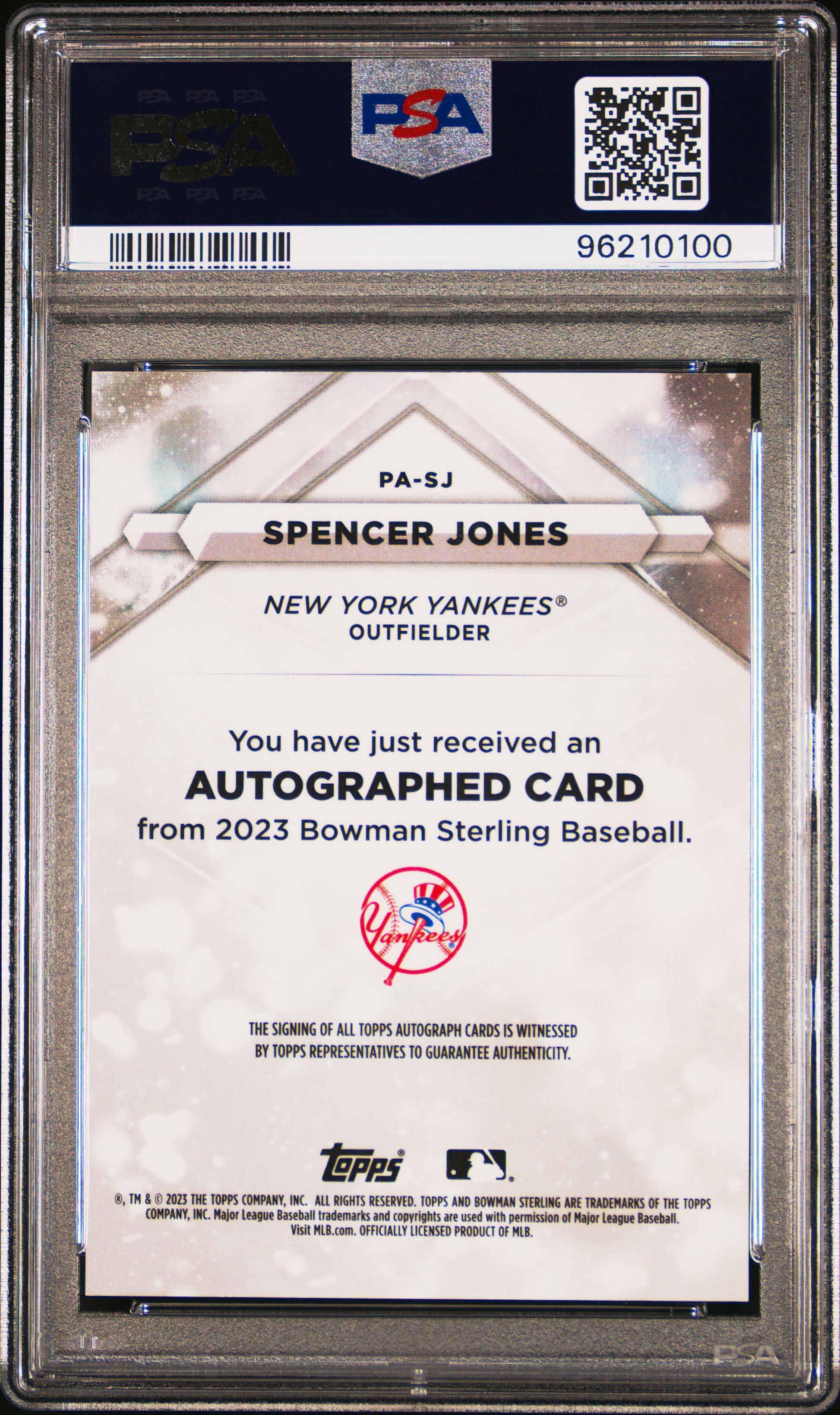 You are purchasing a 2023 Bowman Sterling Prospect Autographs Spencer Jones #PASJ Blue Ref 14/25 PSA. You will receive the exact item in the photographs. Thank you for looking. Listed With Mascot.