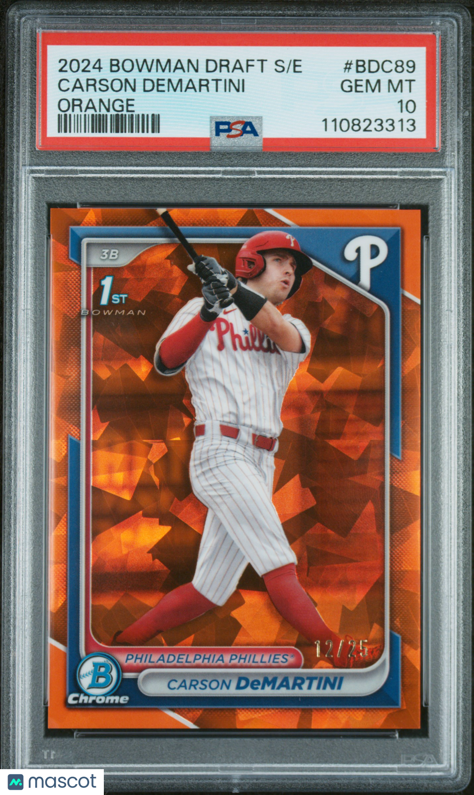 You are purchasing a 2024 Bowman Draft Sapphire Edition Carson Demartini #BDC89 Orange 12/25 PSA. You will receive the exact item in the photographs. Thank you for looking. Listed With Mascot.
