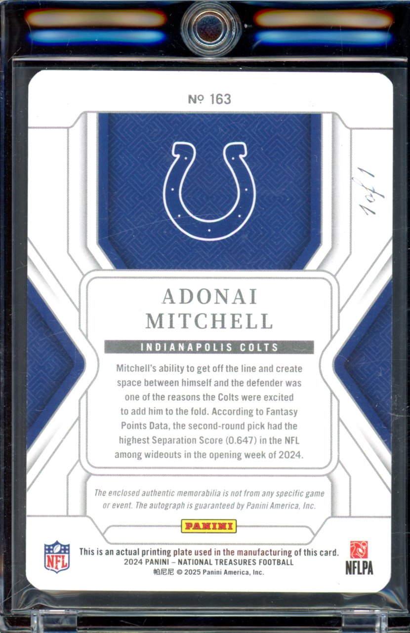 2024 National Treasures Adonai Mitchell 1/1 Rookie Patch Auto Shield