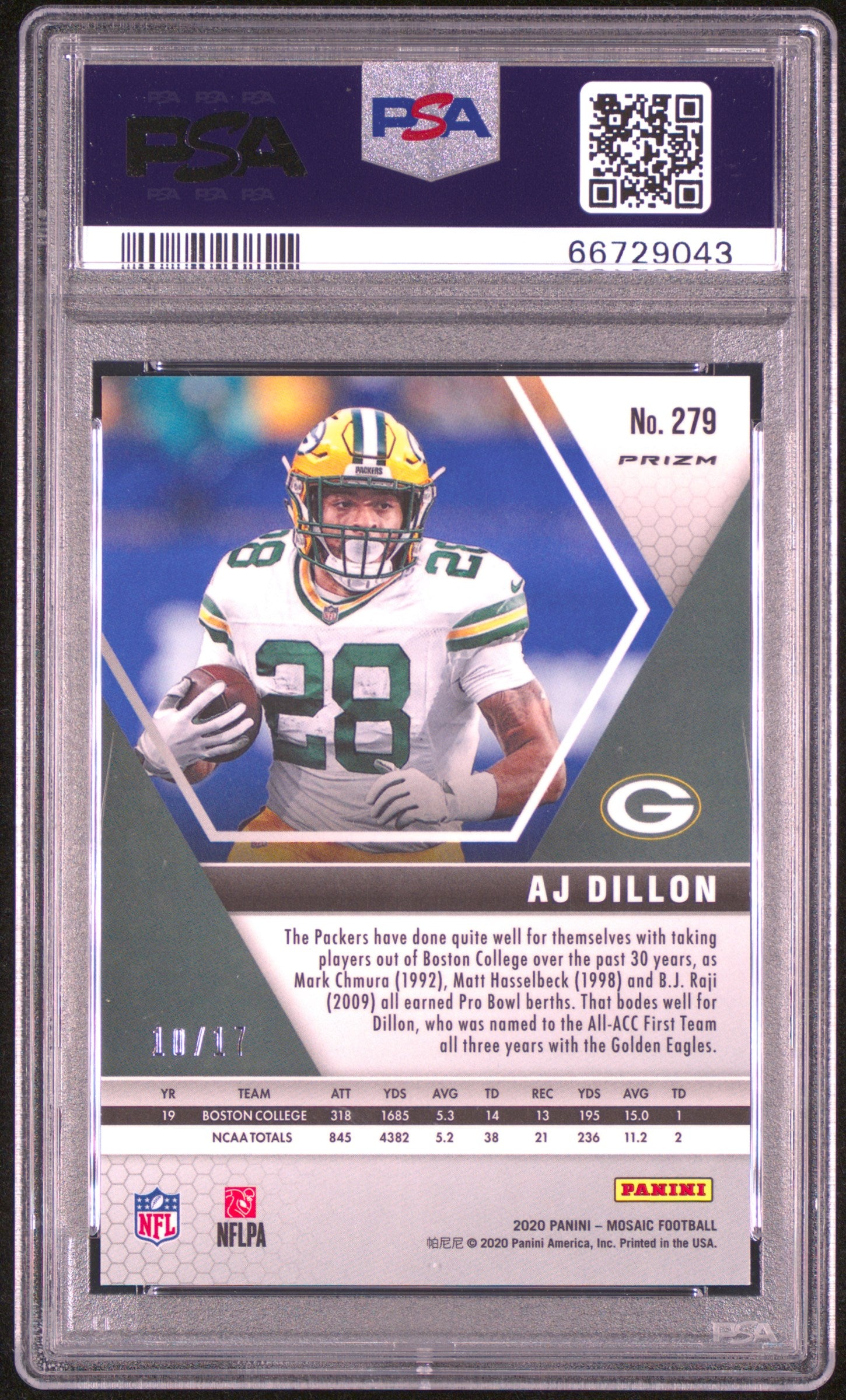 You are purchasing a 2020 Panini Mosaic Aj Dillon #279 Gold Wave PSA. You will receive the exact item in the photographs. Thank you for looking. Listed With Mascot.